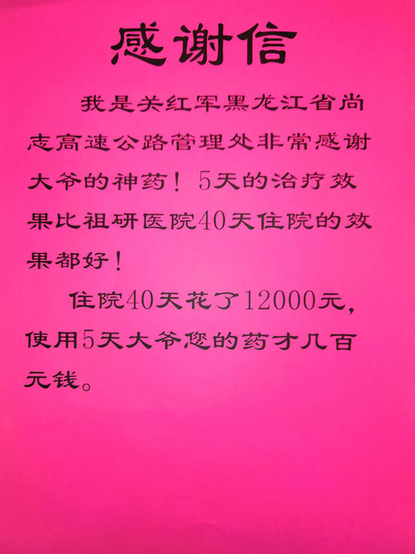 我是关红军黑龙江省尚志高速公路管理处非常感谢大爷的神药!5天的治疗效果比祖研医院40天住院的效果都好!